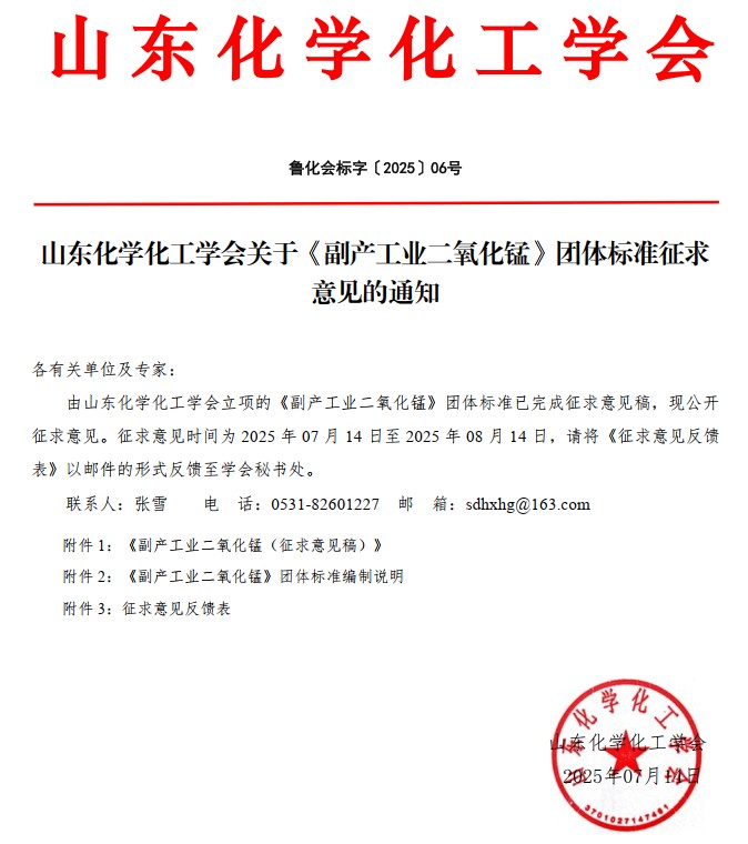 山東化學化工學會關于《副產工業二氧化錳》團體標準征求意見的通知
