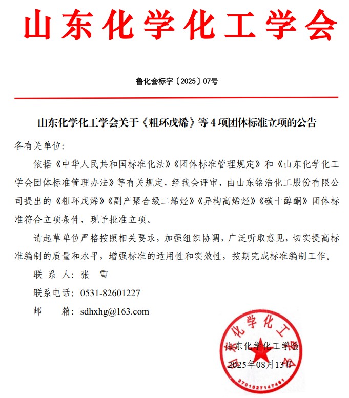 山東化學化工學會關于《粗環戊烯》等4項團體標準立項的公告