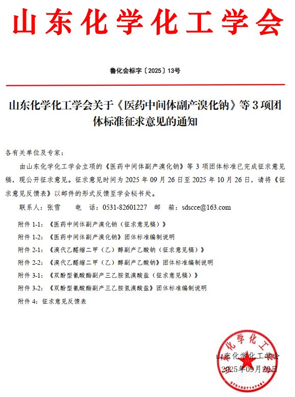 山東化學化工學會關于《醫藥中間體副產溴化鈉》等3項團體標準征求意見的通知