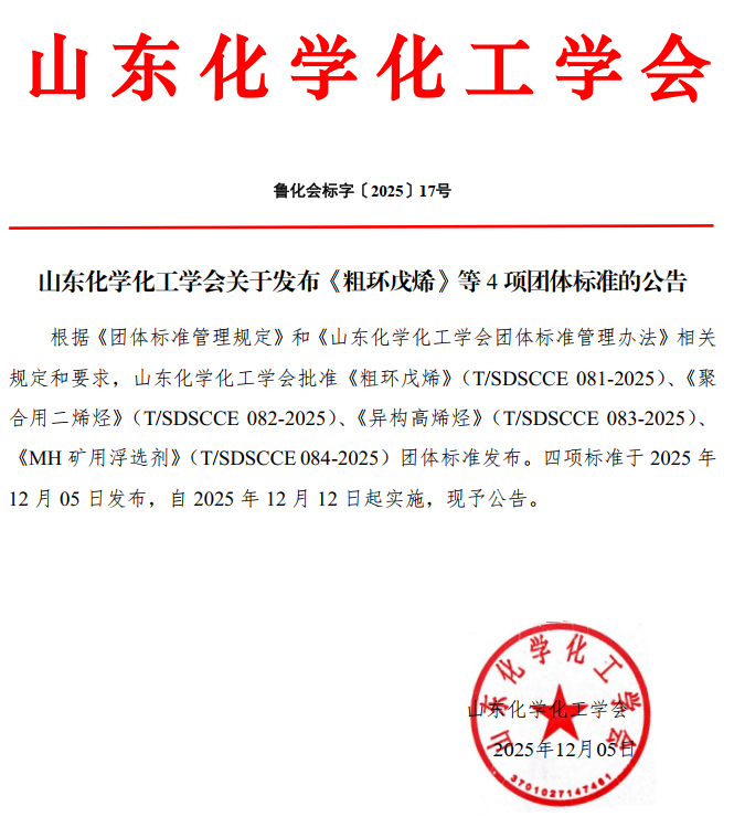 山東化學化工學會關于發布《粗環戊烯》等4項團體標準的公告