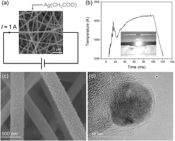 (a) 焦耳加熱法將銀納米顆粒長到CNFs上;插圖為靜電紡絲法制備的CNFs形貌。