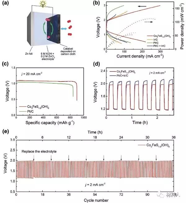 Co3FeS1.5(OH)6的OER和ORR催化性能優于商用貴金屬Ir/C和Pt/C催化劑。Co3FeS1.5(OH)6羥基硫化物在鋅-空氣電池中作為空氣電極催化劑時,在20 mA/cm2充放電電流密度時對應低過電勢0.86V,高的比容量898mAh/g,和長的循環壽命。這種方法拓寬了過渡金屬羥基硫化物在超級電容器,可充電電池,傳感器和醫療保健上的應用。